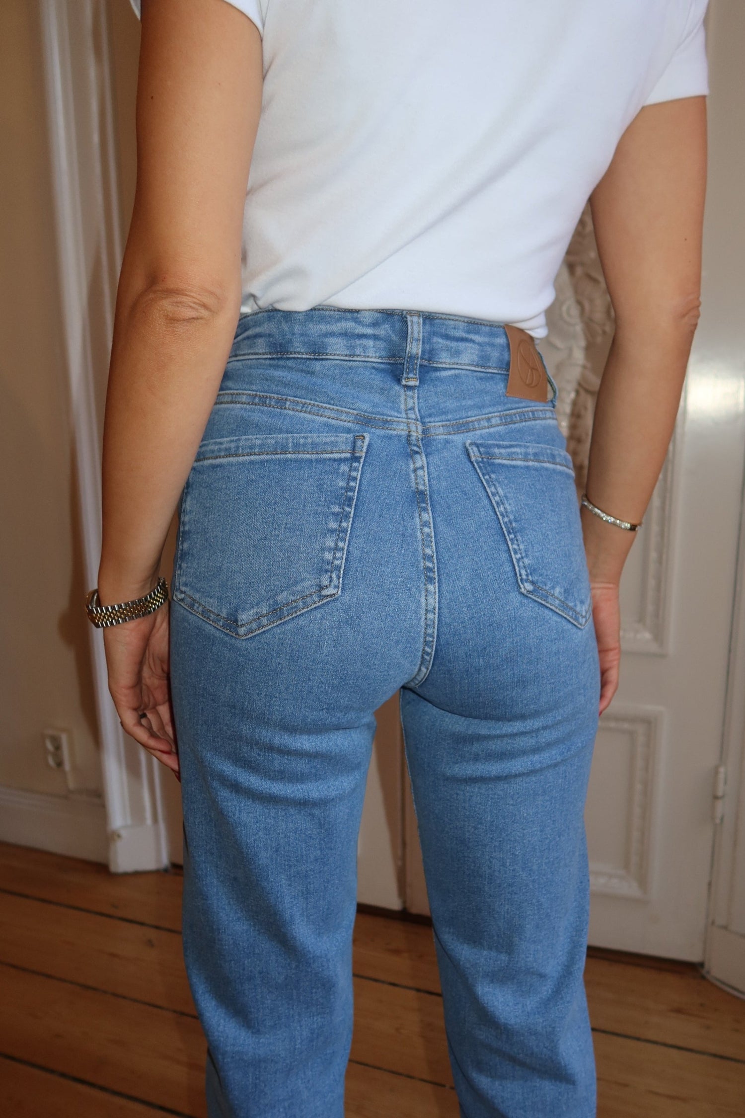 The jeans may feel tighter around the waist, so if you're between two sizes, we recommend you to size up.