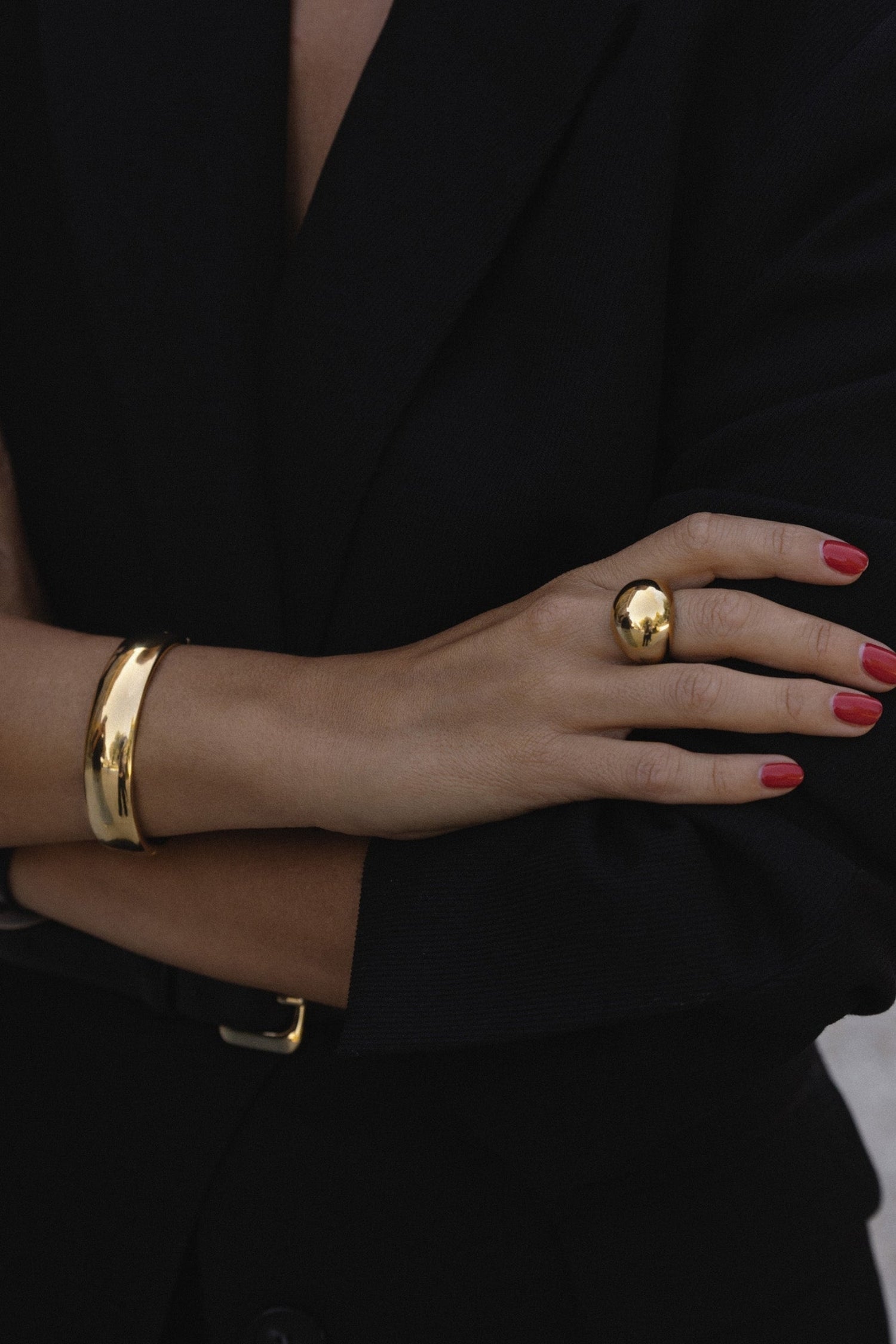 Sonja Ring is a smooth, statement ring that truly catches the eye. I love pairing it with the Sally Earrings and Alexandra Bangle for a sleek and sophisticated look. Imagine this elegant combination with an all-black outfit — the perfect mix of minimalism and luxury!